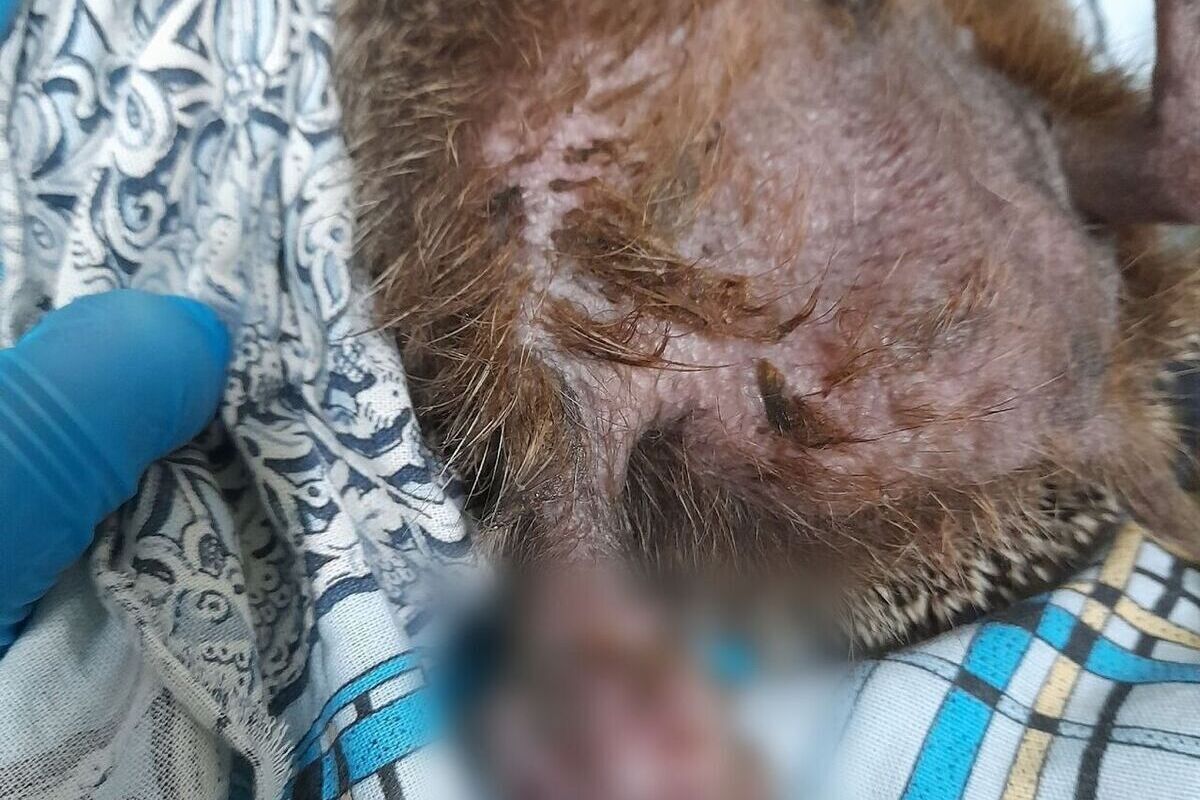 Специалисты сообщили, что у животного выявлено серьёзное повреждение левой задней конечности. Причиной стала странгуляция линейным предметом, из-за чего произошло патологическое изменение тканей. Предполагается, что лапу сдавливала леска.